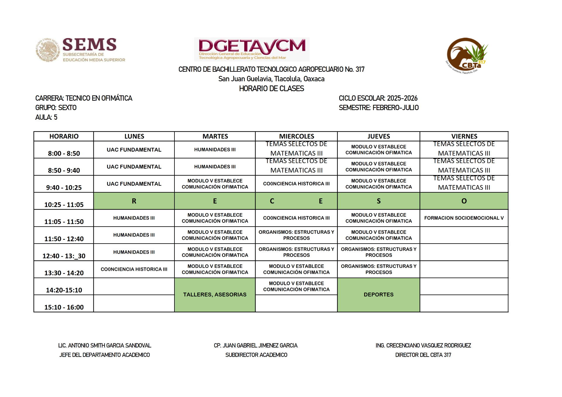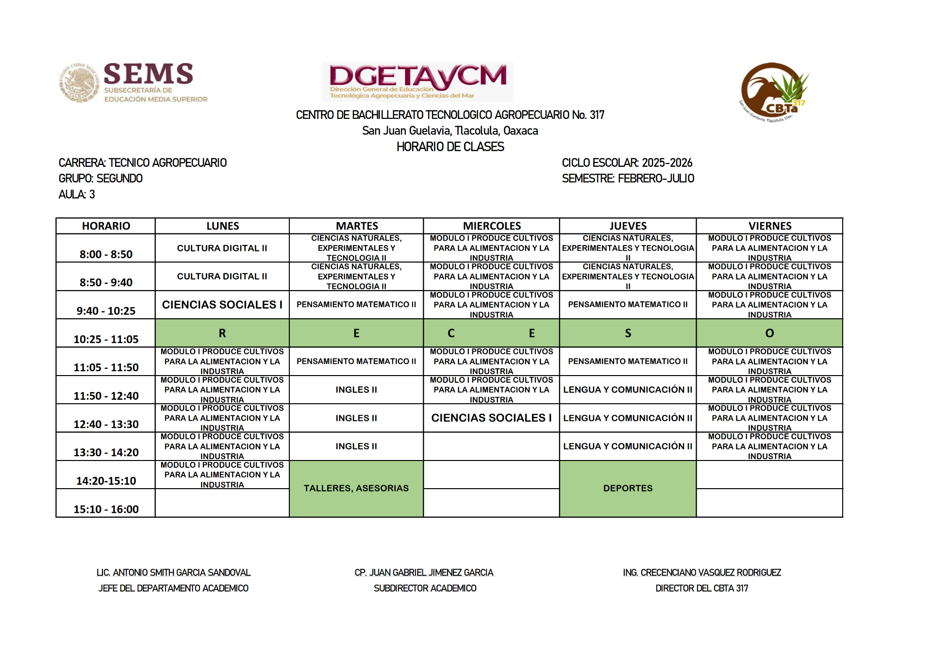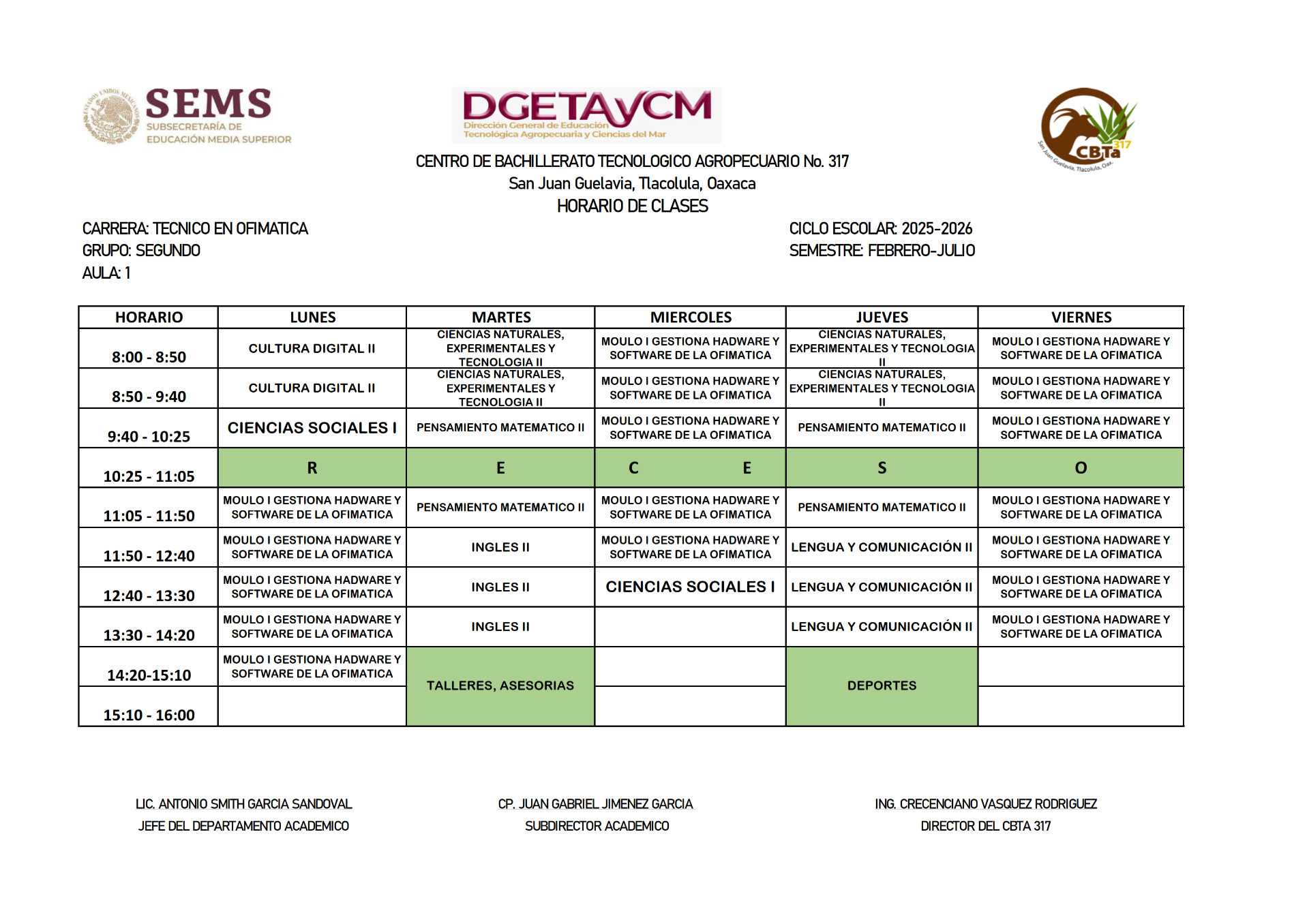 HORARIOS DEL SEMESTRE FEBRERO 2025 - JULIO 2025